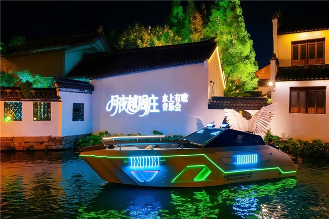 船行歌起,溢彩流光。这个夏末初秋,如果你在周庄夜游,很可能会遇见一艘颇具未来感的游船,它载着时下最流行的音乐,穿梭于小桥流水间,无