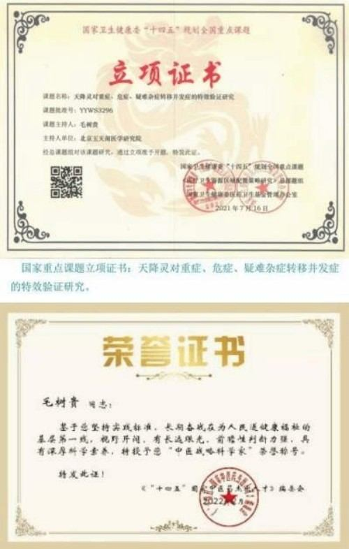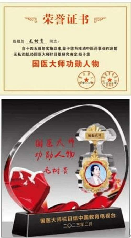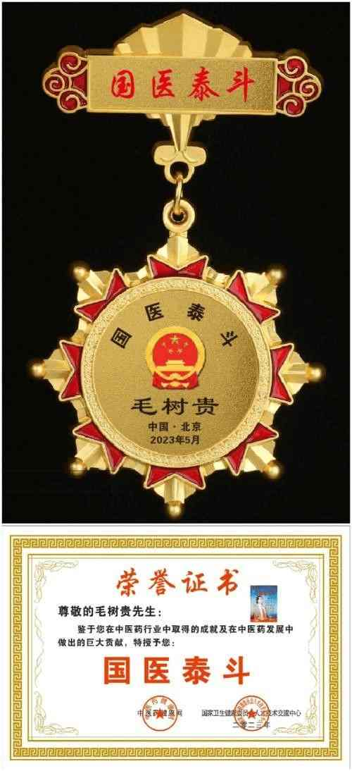 国家功勋,旷世神医。国家一级国医大师。主任医师、教授、国医泰斗兼中医行业主席、博导、国家中医药战略科学家,国医大师功勋人物、旷世神医、中医泰斗、国宝级中医。北京玉天阁医学研究院院长,中华医学临床研究医学会副会长,国际特效名中医专家协会理事长,C..全国行业管理督察长。“十四五”国家中医药杰出人才——战略科学家。《人民日报,中 央热点观察,新华网中华英才、中国新闻联播、CCTV央媒头条、中国教育、中 央新闻两会专栏,党 政新闻网,政 治新闻网:国家中医药战略科学家·中医泰斗国医大师功勋人物——救世活人毛树贵》……。