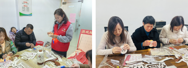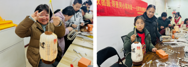 手工制作环节将活动推向高潮,志愿者带领居民共同制作宋韵提灯。大家围坐一堂,相互交流制作技巧,有条不紊地完成裁剪、粘贴、组装等步骤,巧手匠心赋予花灯独特韵味。孩子们在家长陪伴下积极动手,发挥创意装饰花灯,稚嫩的小手与专注的神情为现场增添了温馨童趣。不多时,一盏盏造型别致、色彩鲜亮的元宵花灯相继完工,手持亲手制作的花灯,居民们脸上洋溢着自豪与满足。